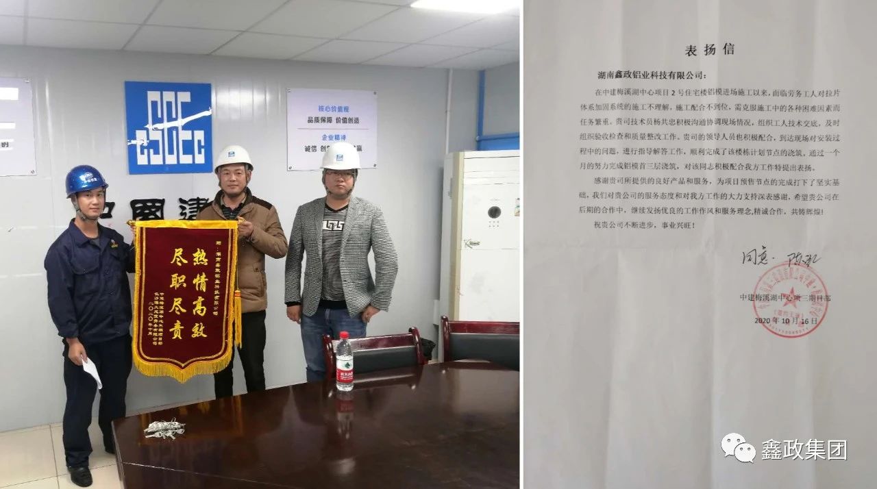 瀏覽次數:1834近日,中建五局第三建設有限公司中建梅溪湖中心項目部和現場勞務公司長沙博大建筑勞務有限公司送來錦旗和表揚信,對鑫政鋁業技術服務科楊共忠在項目上的出色表現給予了充分肯定和高度評價。_20250530091630A310.jpg)
